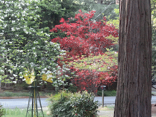 This is a photo I took from my front porch as I was leaving. Spring in our yard is absolutely fabulous. All the colors. The tress are Dogwood and a fruitless plum. The tree is a cedar, a bit too big to see the top!