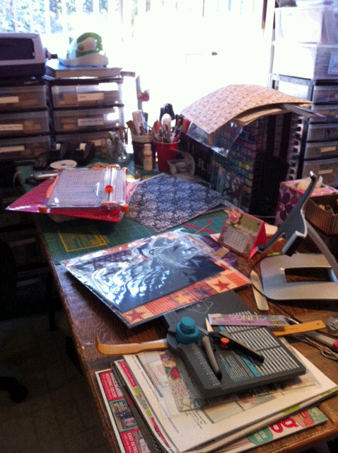 I'm happy.....being in a hurry, I'd forgotten to take a photo of my work desk, so, this morning I ran in to snap this. Looks pretty much the same way today as yesterday. If you are wondering what in the world would make me want to show my messy desk....check it out over at Stamping Ground. And play along. You will meet lots of creative people there. And Miss Julia, she's always got something going on in her life. I wonder how she finds time to do all she does!