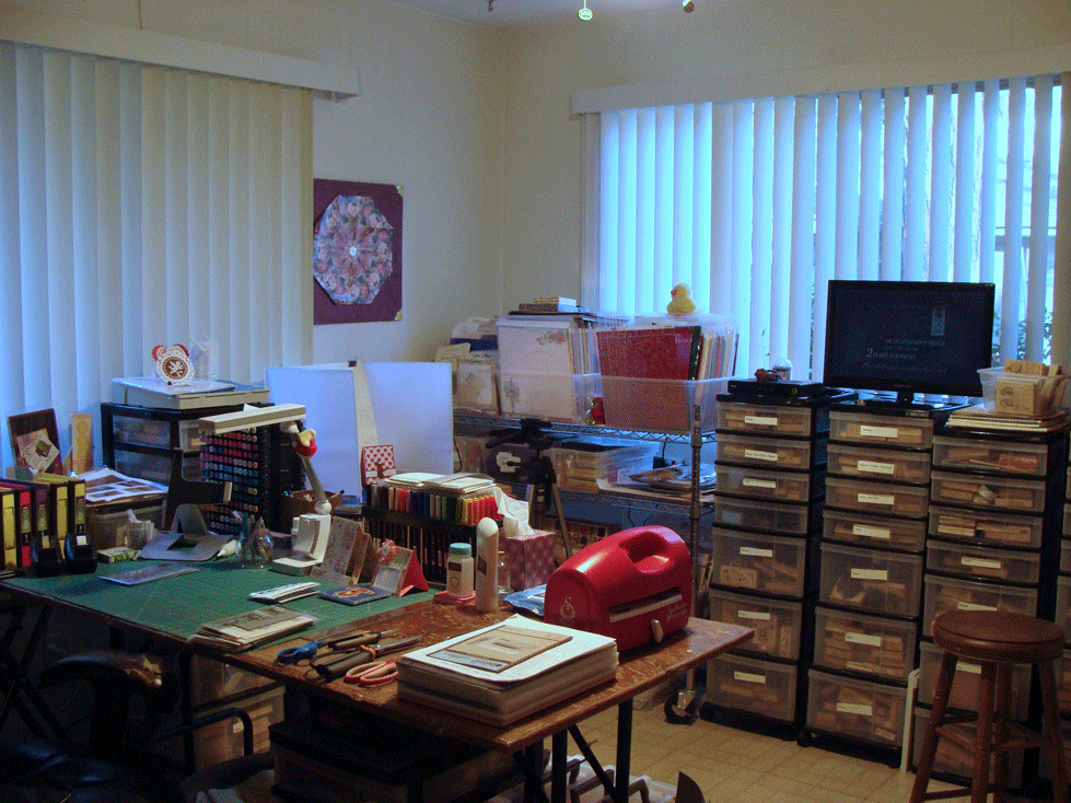 Well, that's what I've been up to. And when I show the photo you will probably say, which item did you move? Trust me, I've been very busy, getting rid of things I don't need, to make room for the things I do. What started as just down sizing my papers, move to getting rid of two paper holders that never seem to get used, then it went to organizing envelopes, and then ribbon, and then Christmas embellishments, and then, and then and then! Seems the more I organized the more messy my room became. Until finally it was looking pretty good. I still am trying to put 20 pounds of goods into a 2 pound bag...hmmmm! Does this make me a hoarder? Maybe! Are you ready? Here it is....